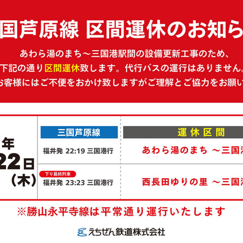 【1月22日】三国芦原線 設備更新工事に伴う一部列車区間運休のお知らせ