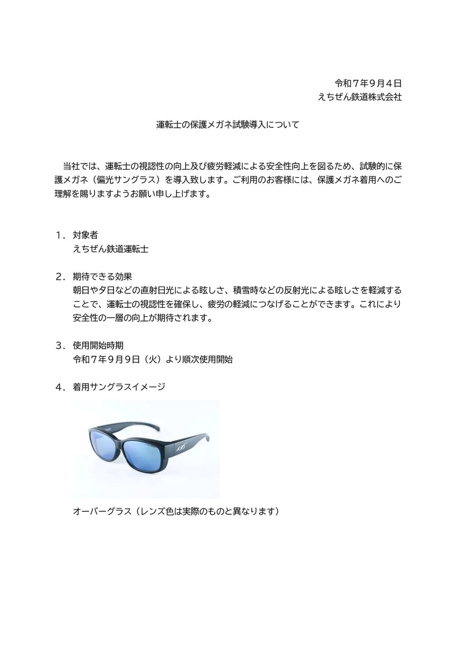 当社では、運転士の視認性の向上及び疲労軽減による安全性向上を図るため、試験的に保護メガネ(偏光サングラス)を導入致します。ご利用のお客様には、保護メガネ着用へのご理解を賜りますようお願い申し上げます。