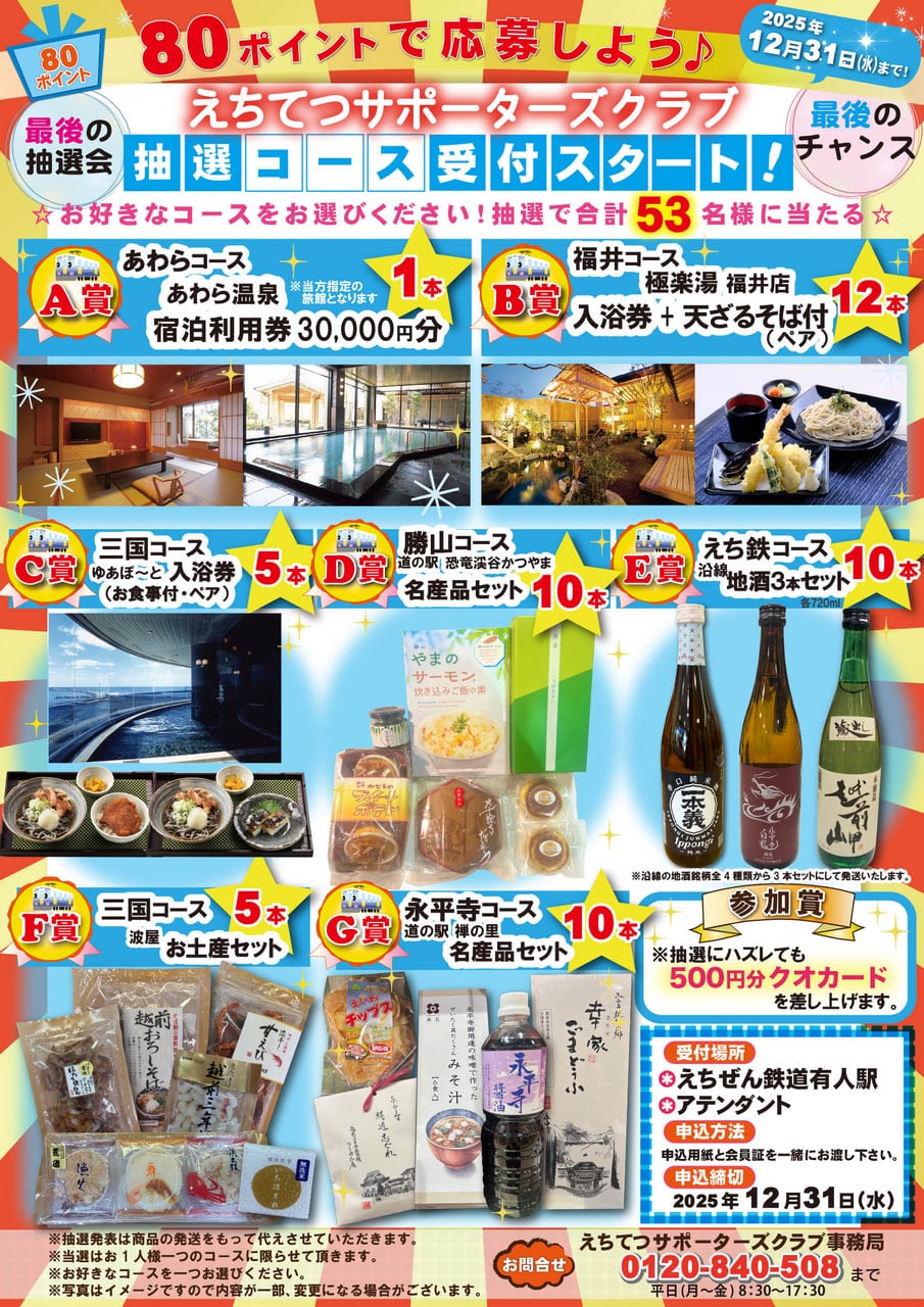 11月1日(土)より えちてつサポーターズクラブ会員特典ポイント80点を一口として、「抽選コース」の応募受付を