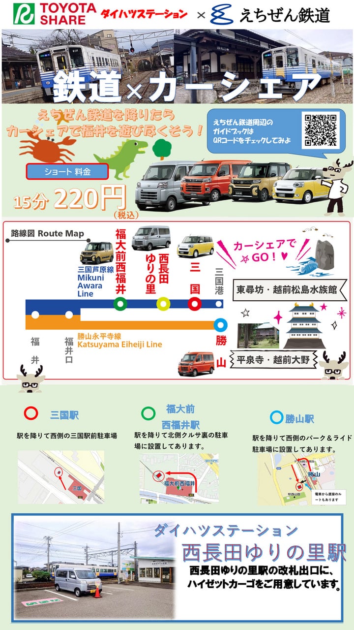えちぜん鉄道では、福井ダイハツ販売株式会社様との連携事業としてカーシェリングを実施しています。