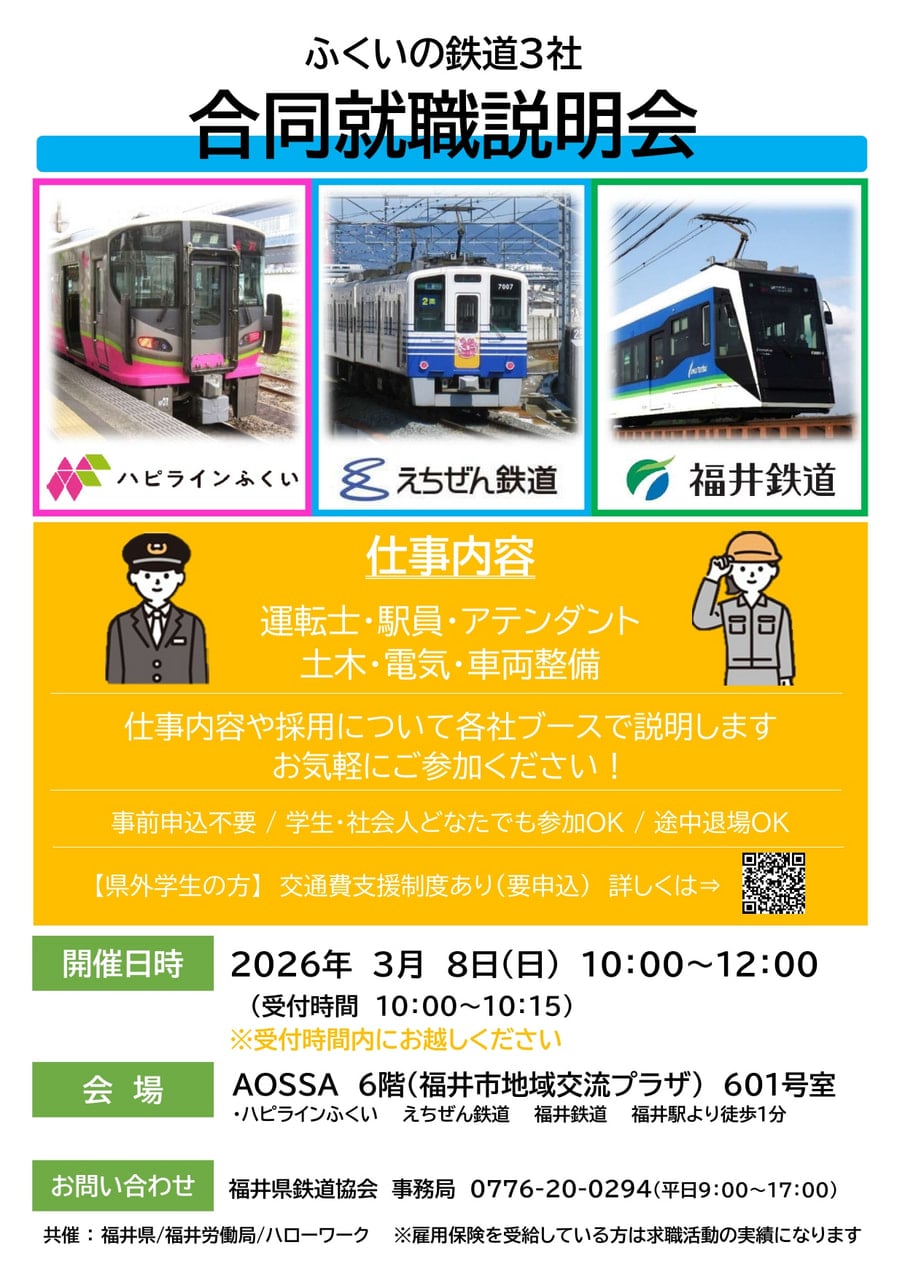 福井県内の鉄道3社(えちぜん鉄道、ハピラインふくい、福井鉄道)が合同で、「ふくいの鉄道3社合同就職説明会」を開催します。