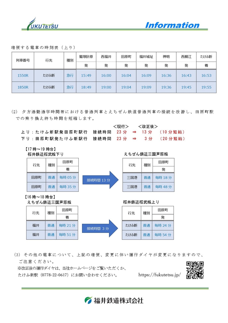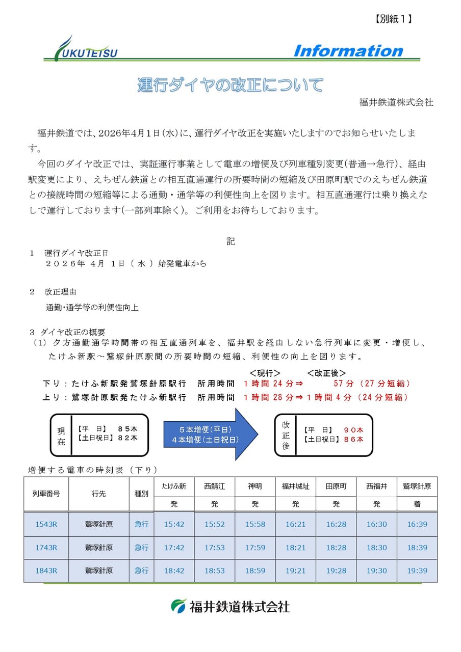 福井鉄道株式会社が実施する実証運行事業に伴い、田原町フェニックスラインの利用促進を目的として、当社におきましても福井鉄道との相互直通便のダイヤ改正および連絡定期券の運賃改定を実施いたしますので、お知らせいたします。