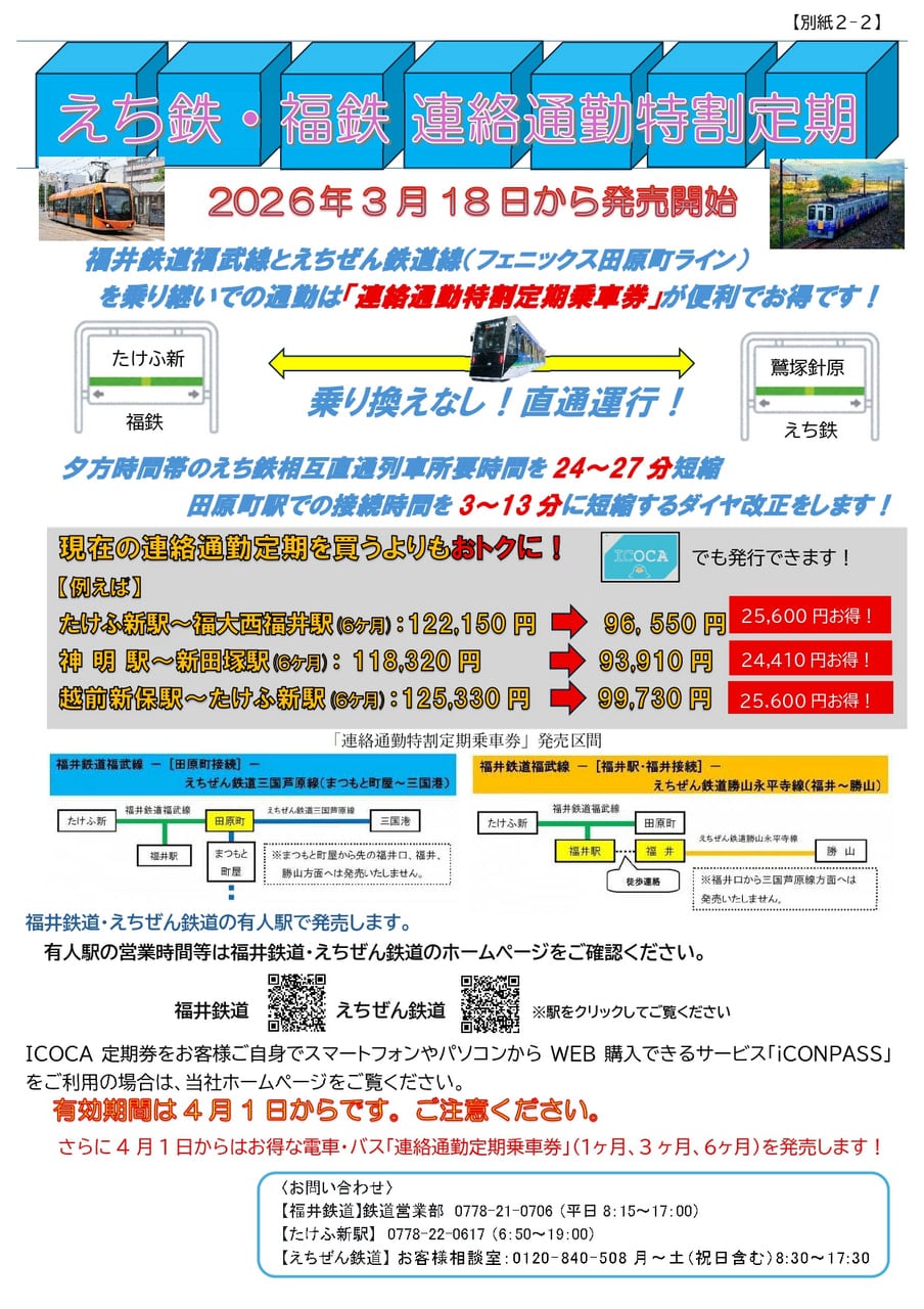 福井鉄道と、えちぜん鉄道を乗り継ぐ連絡通学定期券および連絡通勤定期券の割引(最大22%)を実施します。