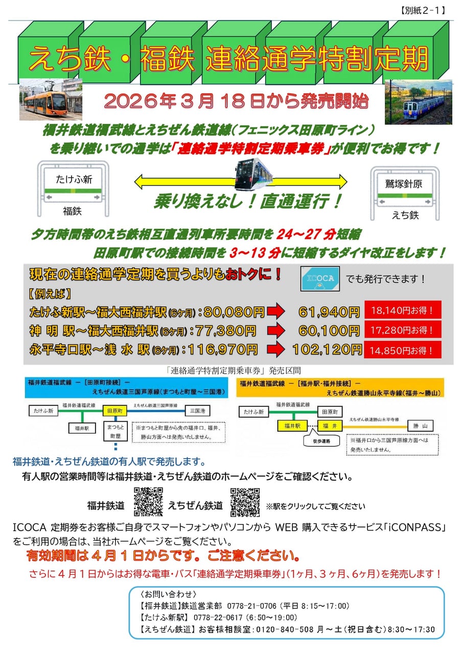 事前に割引適用の定期券をご購入を希望される場合は、福井鉄道駅窓口にて3月18日からご購入いただけます。