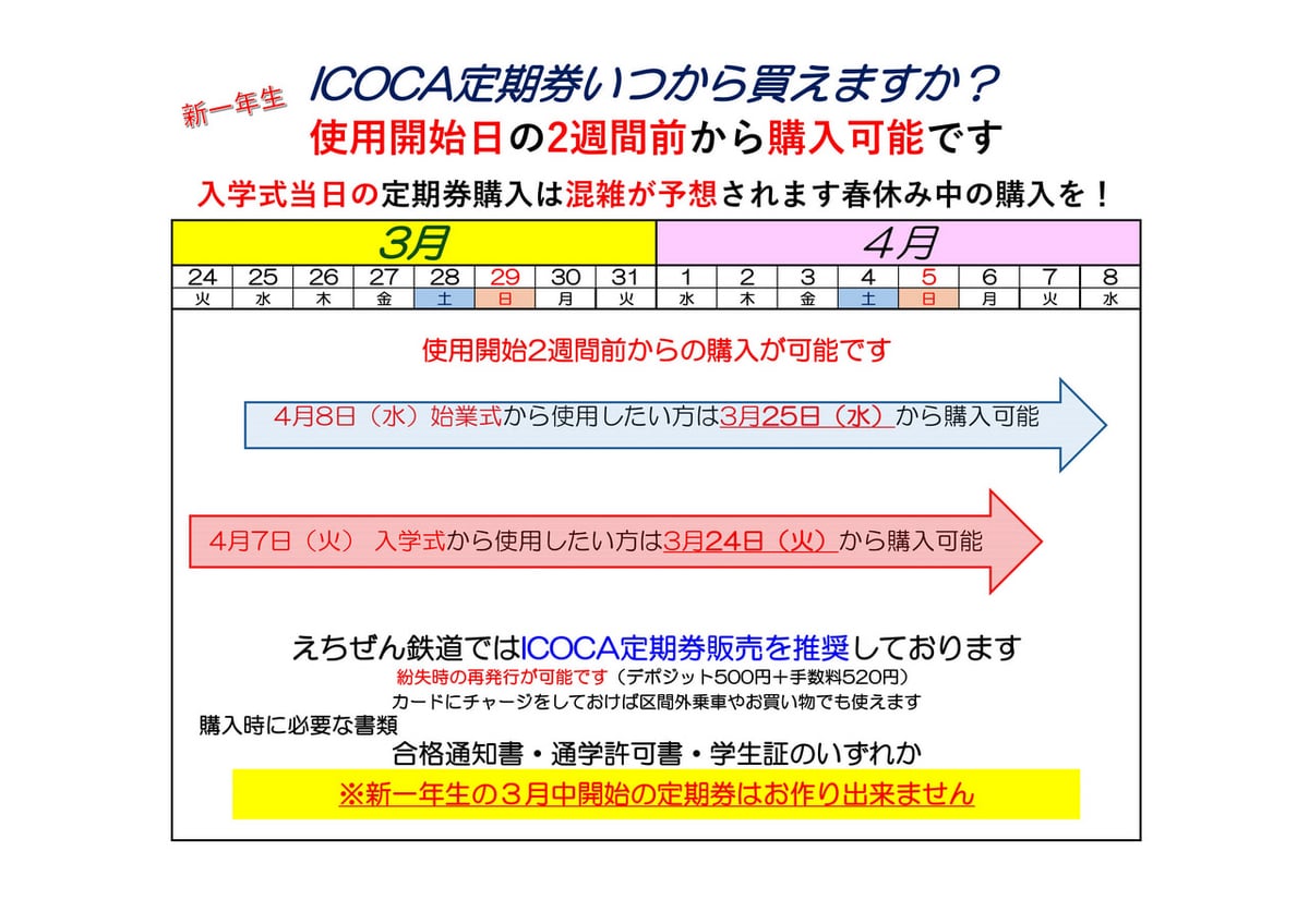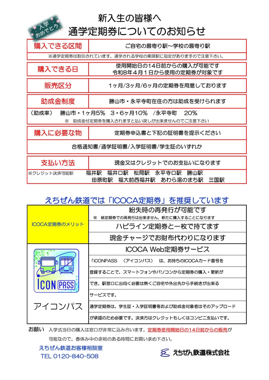 新入学生の皆様へ通学定期券購入に関するお知らせです。